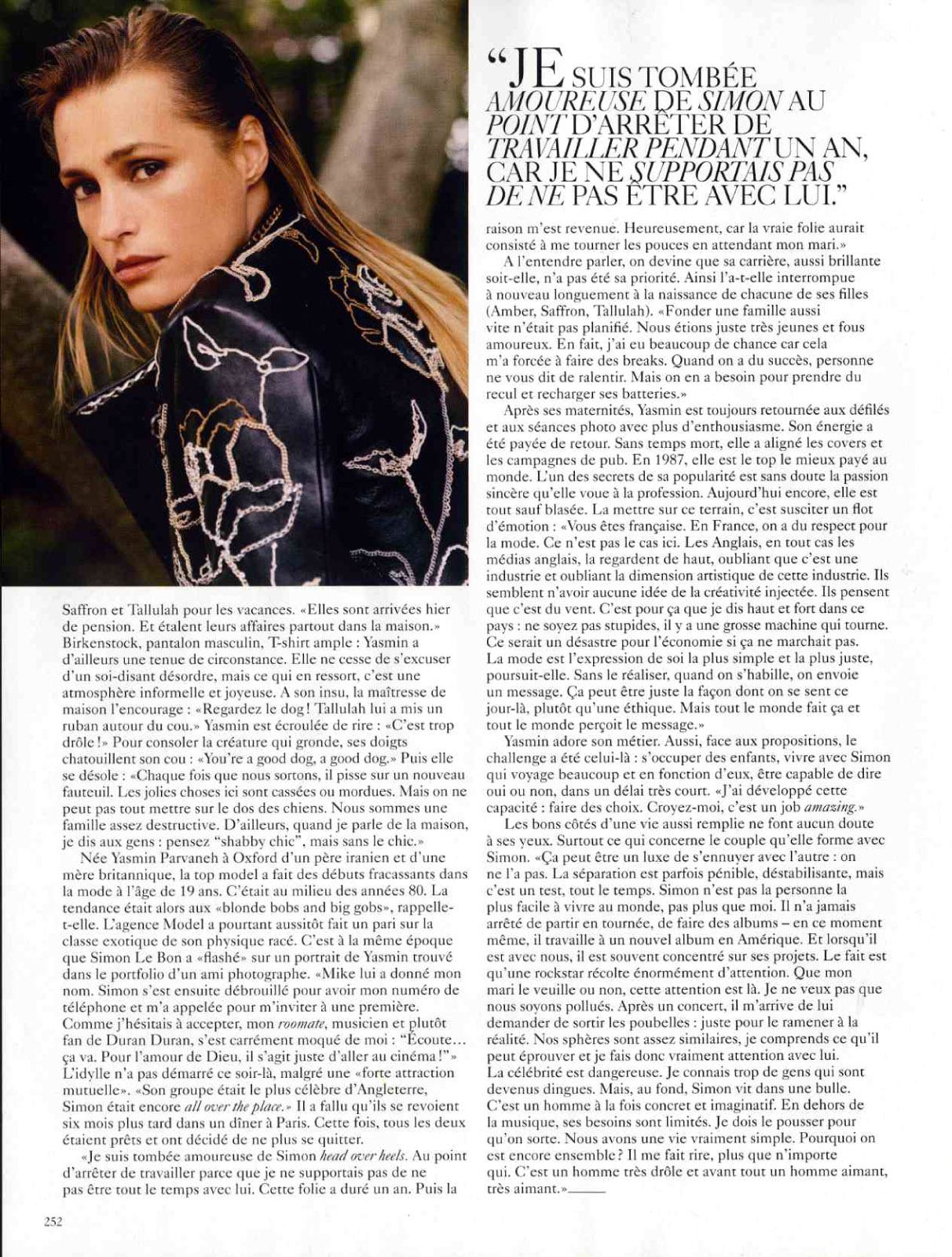 Born Yasmin Parvaneh in Oxford to an Iranian father and an English mother, the top model made her stunning entrance into fashion at the age of 19. It was the mid-1980's. The tendency at the time was for "blonde bobs and big gobs," she recalls. The agency Models 1, however, soon took a risk on the exotic side of her distinguished physique. It was also around this time that Simon fell in love with a portrait of Yasmin in the portfolio of a photographer friend. "Mike gave him my name. Simon next managed to get my phone number and called me to invite me to a premiere. Since I was hesitant to accept, my roommate, a musician and quite a Duran Duran fan, straight out made fun of me. "Listen... it's okay. For the love of God, it's just going to the movies!" The love affair didn't start up that night, despite a "strong mutual attraction." "His group was the most famous in England. Simon was still all over the place." They had to wait until six months later when they saw each other at a dinner in Paris. This time, they were both ready and decided never to break up again.